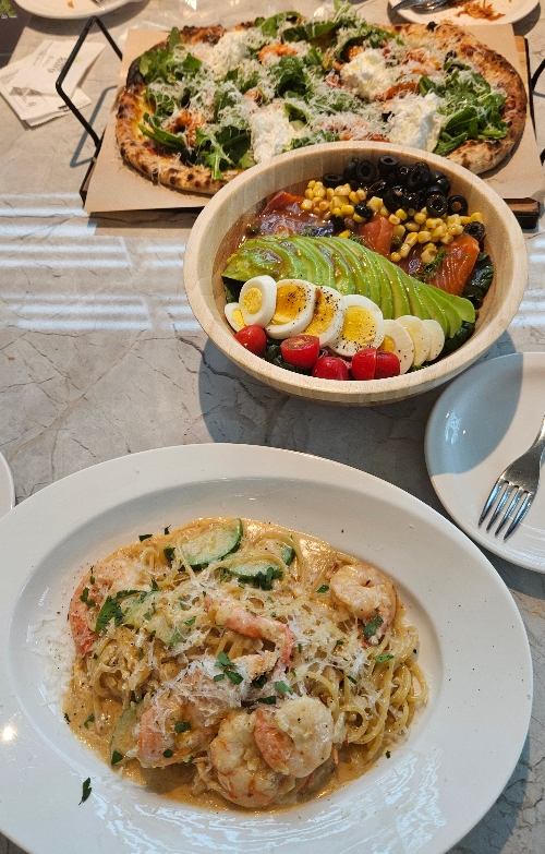 우린 4명이가서 샐러드 피자 파스타 커피 2잔과 어린이 음료 주문.